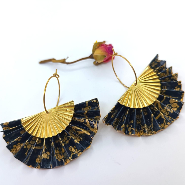 Pendientes de origami en forma de abanico, papel japonés, con pieza de latón y montados en acero inoxidable, hechos a mano y barnizados para darles resistencia.